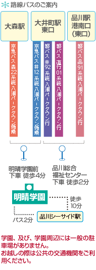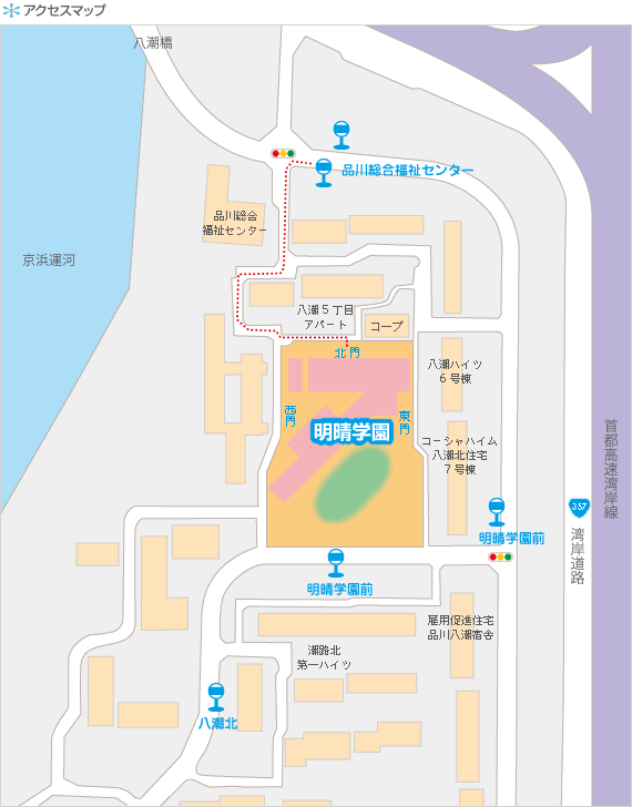アクセス 〒140-0003 東京都品川区八潮 5-2-1 ~最寄り駅からの行き方~ ◆大井町駅(東口) 都営バス[#92] 八潮パークタウン行(12分)、品川総合福祉センター下車 徒歩2分(北門) ※大井町駅から徒歩20分 ◆品川駅(港南口) 都営バス[品91] 八潮パークタウン行(16分)、品川総合福祉センター下車 徒歩2分(北門) ◆大森駅(東口) 京急バス[森22] 八潮パークタウン循環(20分)、明晴学園前下車 徒歩4分(北門) ◆品川シーサイド駅から徒歩10分